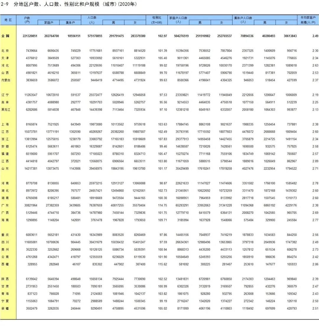 分地区户数、人口数、性别比和户规模(城市)(2020年)。图片来源于《中国统计年鉴2021》