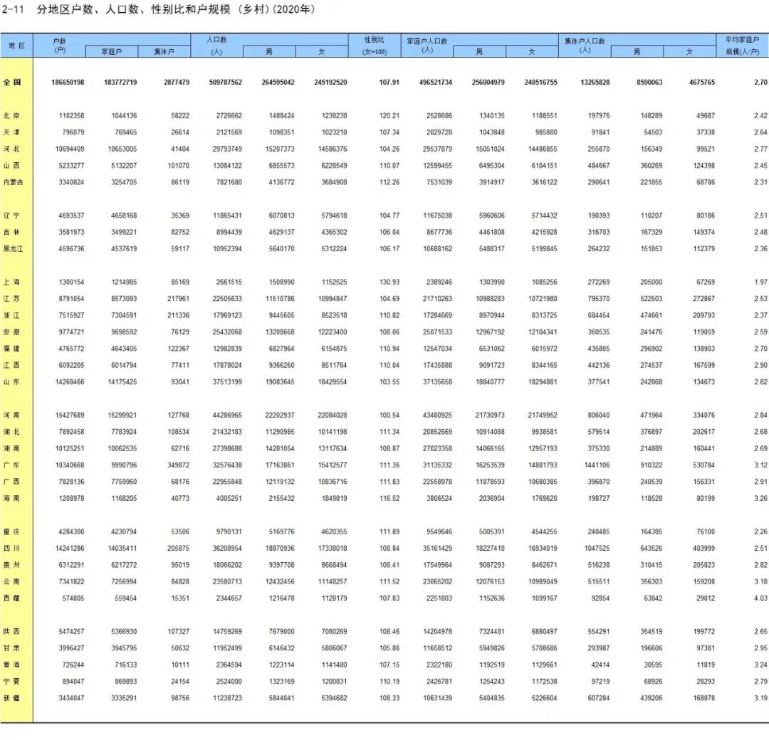 分地区户数、人口数、性别比和户规模(乡村)(2020年)。图片来源于《中国统计年鉴2021》