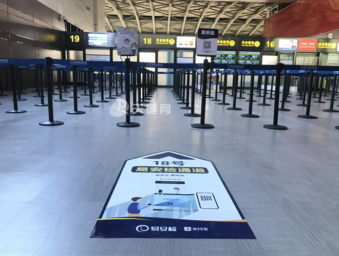 4、“易安检“旅客出行当日,完成值机手续,到达安检现场18、19通道后,出示“易安检”通行码,即可进入安检通道体验安检服务。