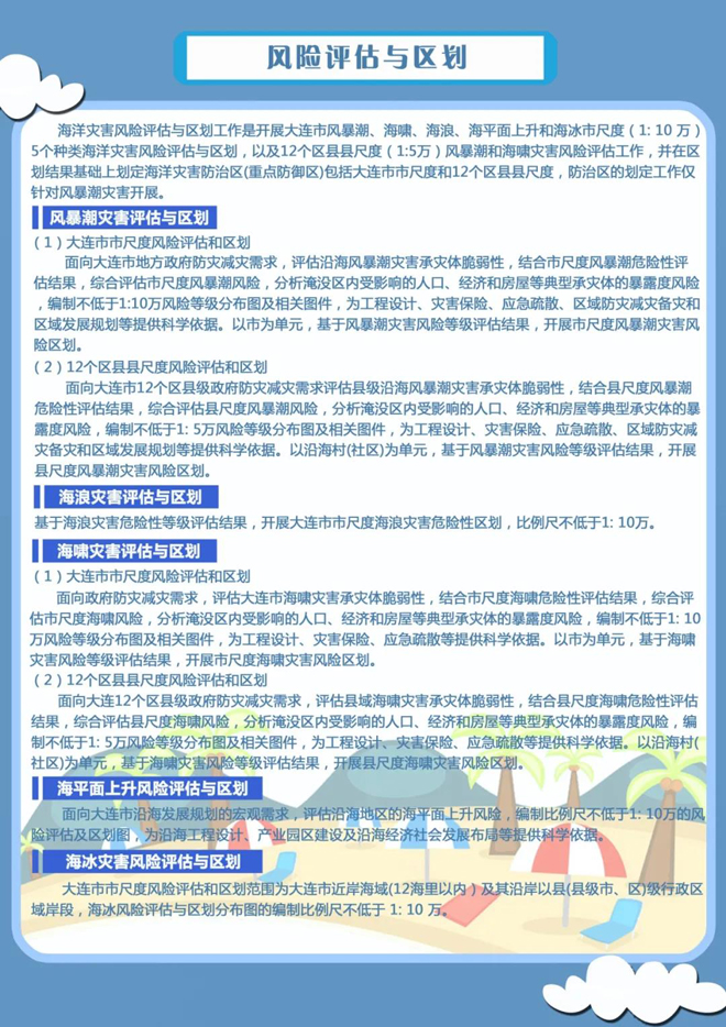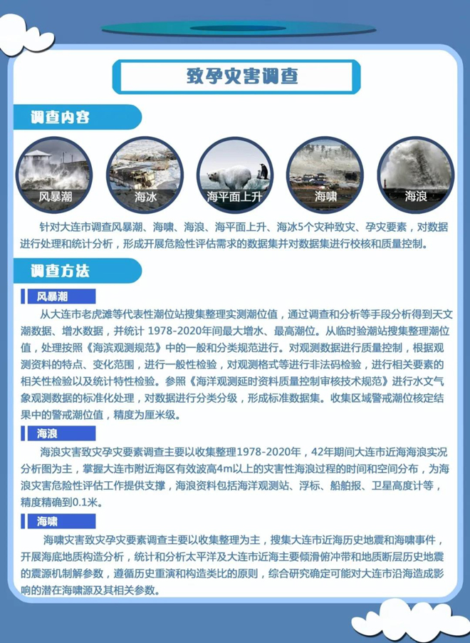 为加强积海洋灾害风险普查宣传工作,大连市自然资源局编制了《一图读懂大连市海洋灾害风险普查》,向公众宣传海洋灾害风险普查对保障国民经济和社会发展、提高我市自然灾害防治能力的重要意义,引导各级政府和社会各界了解、认同、支持海洋灾害风险普查工作。