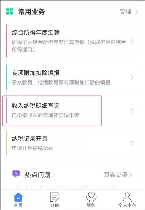 操作流程:个人所得税APP首页,点击“常用业务”中“收入纳税明细查询”进入;选择纳税记录年度,并选择所得类型即可。