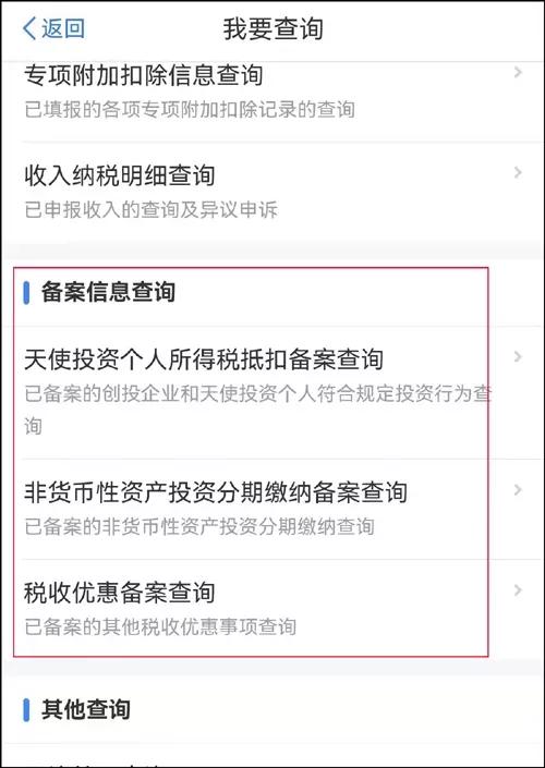 操作流程:从首页点击“我要查询”进入,可以看到“备案信息查询”中的三项税收优惠备案查询项目,包括:天使投资个人所得税抵扣备案查询、非货币性资产投资分期缴纳备案查询、税收优惠备案查询(已备案的其他税收优惠事项查询)。