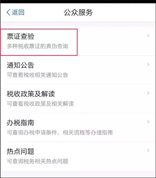 1. 打开个人所得税APP,点击进入“公众服务”模块,点击“票证查验”项目。