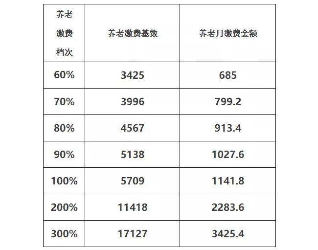 在2021年全省全口径平均工资公布前,暂按2020年全省全口径平均工资确定养老保险缴费标准,选择60%、70%、80%、90%、100%、200%、300%七个档次的,对应按3425、3996、4567、5138、5709、11418、17127元/月缴费基数标准进行缴费。其中,2021年已选择3284元/月档次的自动调整为最低缴费档次3425元/月。