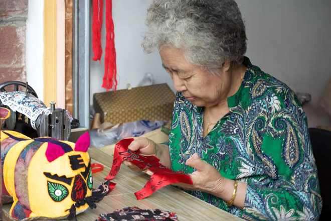 民间艺人田奶奶跟布老虎打了40多年交道,完成了上万个形态各异的作品