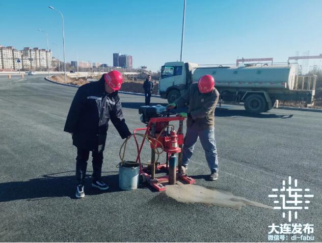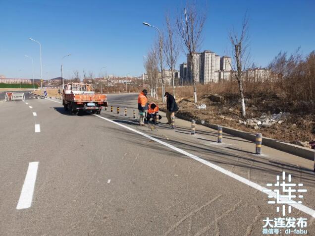 1月28日下午,在甘井子区振连路前盐村路段,施工人员给新建的振连路立交导改路安装隔离护栏,喷涂新的导向标线,为通车做最后的准备工作。