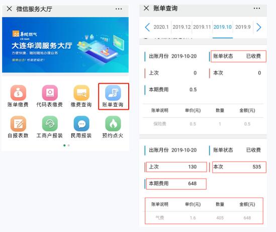 查询历史欠费和当期费用,并一起结算,因历史欠费需单独查询。若用户当月30日前在大连华润燃气微信公众号里结算过燃气费,那么次月联合收费处将没有燃气费账单。