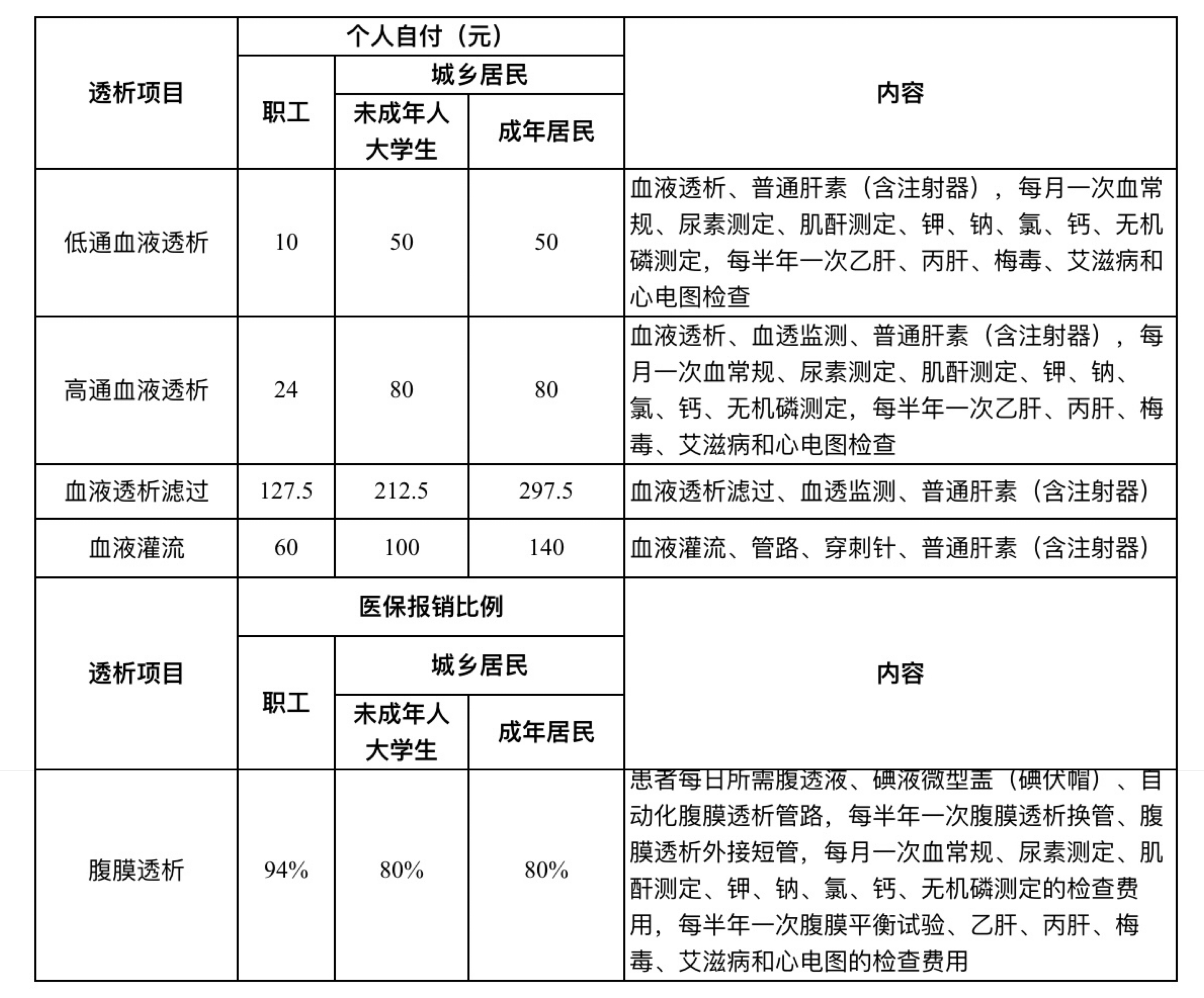 参加医疗保险的人员在门诊进行血液透析治疗,医疗保险将按照低通血液透析服务包和高通血液透析服务包分别确定医保支付标准和个人负担标准。