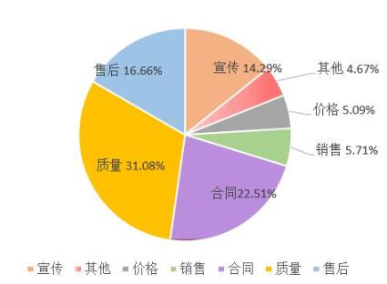 按投诉性质分类,质量问题占31.08%;合同问题占22.51%;售后服务问题占16.66%;宣传问题占14.29%;捆绑销售问题占5.71%;价格问题占5.09%,其他问题占4.67%。