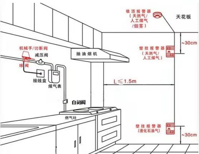 专业人士提醒市民:天然气报警器要求用户安装在距棚顶30厘米位置,正前方不得有遮挡物;与灶具及排风口的水平距离应当大于0.5米;单个报警器与释放源中心水平距离应当大于1米、小于8米。