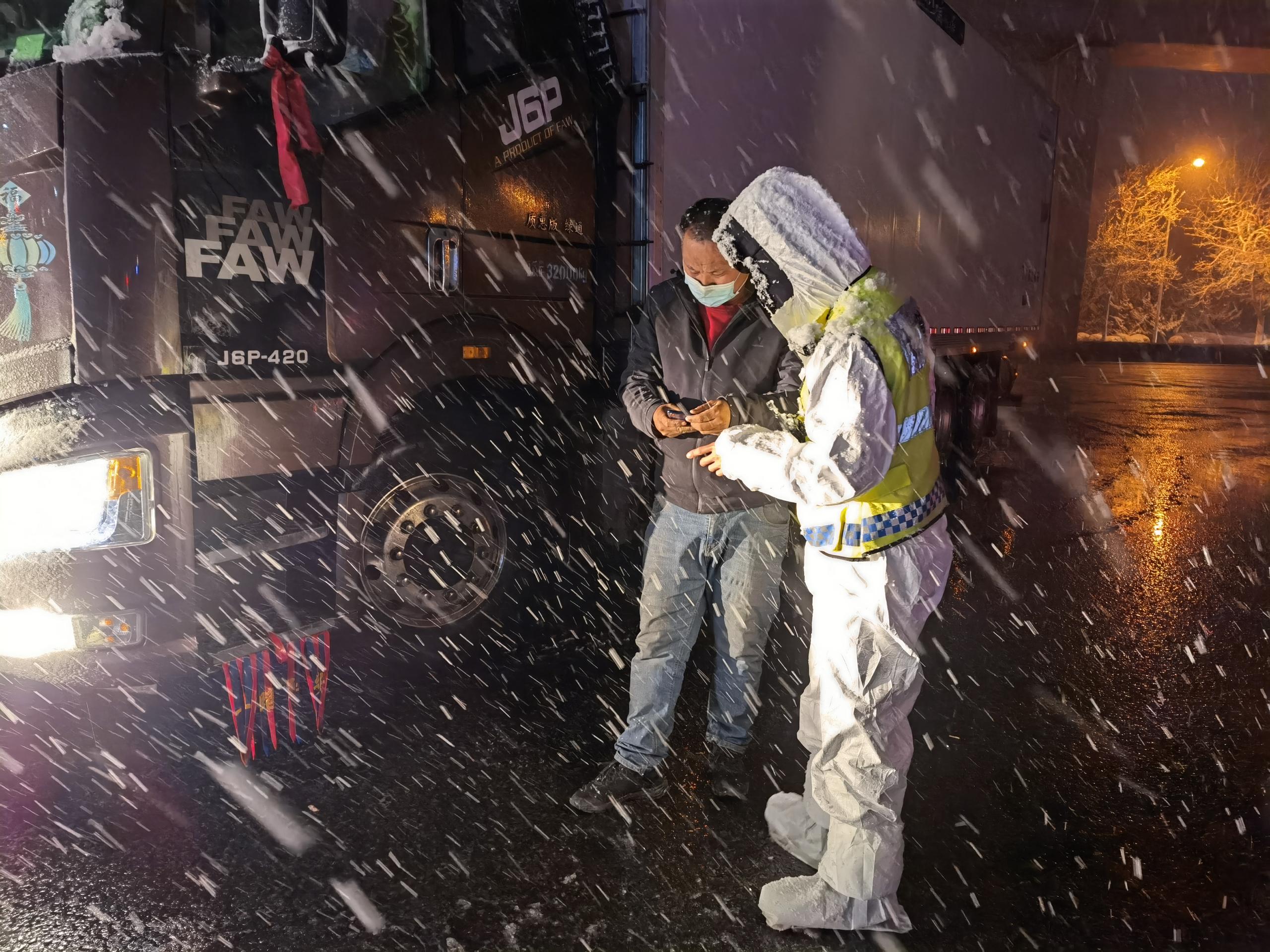 为确保风险管控,交警大队启动封闭路段卡点24小时工作制度,各主要管控路口的执勤民警,彻夜冒雪坚守在岗位一线,认真引导、审验过往车辆。