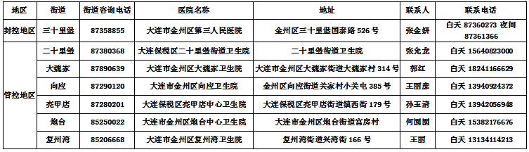 ■ 管控区(二十里堡、大魏家、向应、亮甲店、炮台、复州湾6个街道全域)内居民的医疗救治服务主要由所在街道属地卫生服务机构承担。