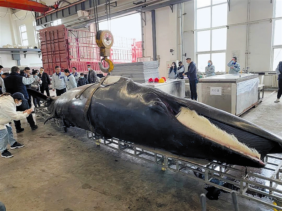 “搁浅”小须鲸运抵鸿峰公司。贾璐 穆琳 摄影报道