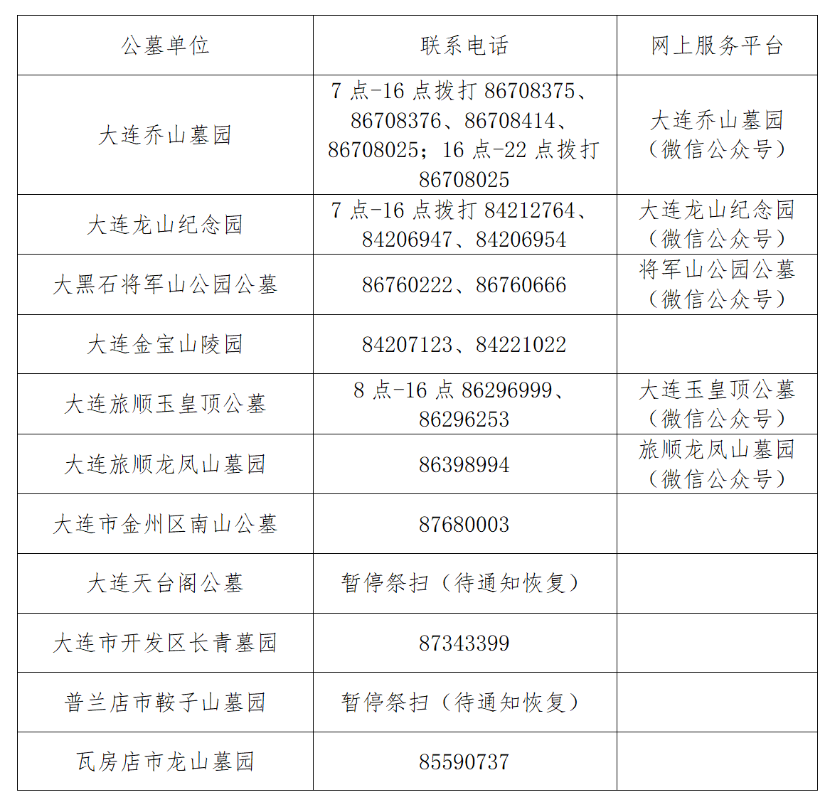 按照大连市新冠肺炎疫情防控总指挥部《关于做好清明节期间安全文明祭扫的通告》要求(https://mp.weixin.qq.com/s/rmIOFWJtRkz-mTW9x7tZNw,点击查看通告),为方便市民参加祭扫活动,现将我市经营性公墓联系方式公告如下: