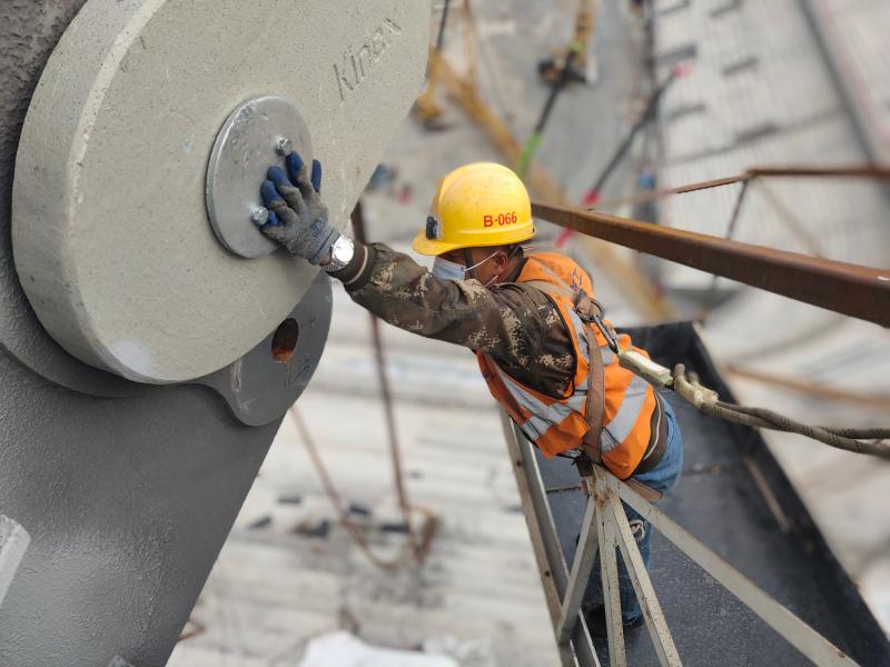 施工设备高速运转、施工车辆穿梭往来、施工人员一刻不闲……5月1日,随着最后一根下径向索安装至压环梁,大连梭鱼湾足球场迎来新节点,屋面双层索网体系全部提升完成。