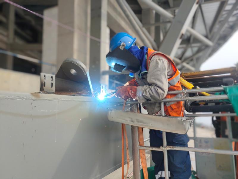 这个“五一”假期,梭鱼湾足球场建设工地依旧是一派热火朝天的景象。施工现场,屋面膜结构环节,工人正在进行机械设备组装;机电安装的工人正在进行虹吸雨水工程施工;外幕墙工程以及吊顶空间转换层施工也在加紧进行。