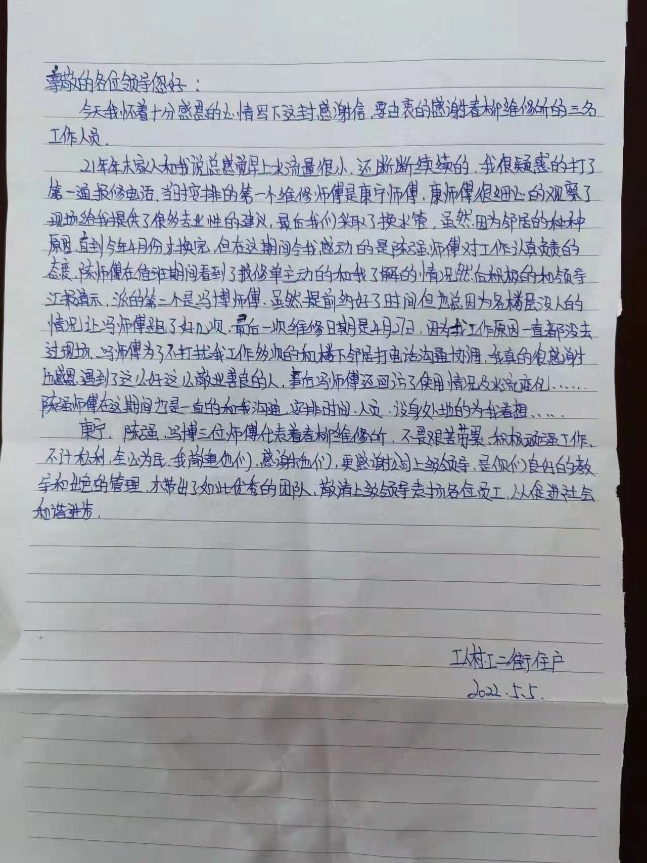 “这是我平生第一次写信,我要以这封手写感谢信,表达我心中真挚的感谢之情。”5月16日,王女士将感谢信送到大连自来水集团甘东分公司。
