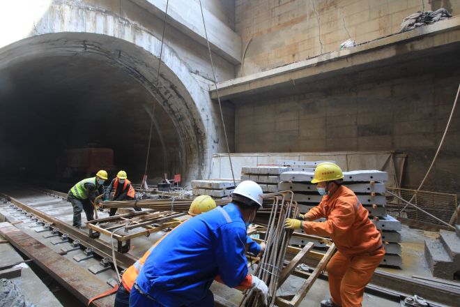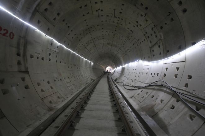 穿过中间风井段,正式进入海域段。只见原本的单洞隧道,已经被混凝土结构分割成两个相对独立的隧道,左右线铺轨已经完成。拉载钢筋等原材料的轨道运输车,在隧道内自由通行。