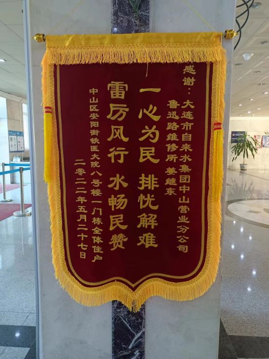 “一心为民、排忧解难,雷厉风行、水畅民赞。”5月30日,中山区安阳街铁路医院大院八号楼居民将一面锦旗连同一封感谢信,送到大连自来水集团中山营业分公司。