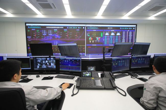 同层还设有一间中控室,控制台和落地大屏幕上显示着电站各种设备的运行数据。