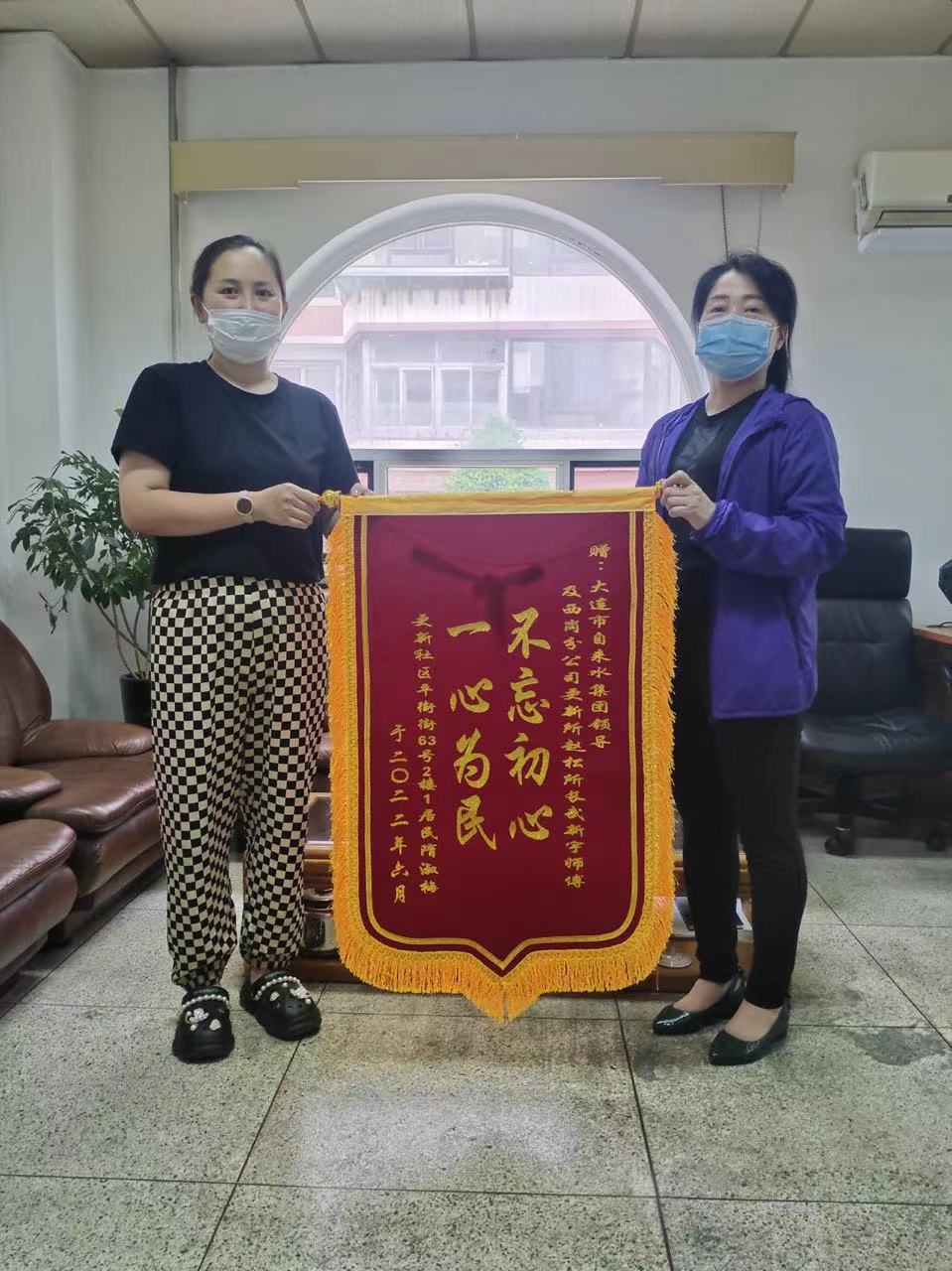 “不忘初心,一心为民”,7月4日下午,西岗区平等街的隋淑梅阿姨委托当地社区给市水务集团自来水公司送来一面绣着这样八个大字的锦旗,对西岗分公司更新维修所赵松所长及武新宇师傅表达诚挚的谢意。