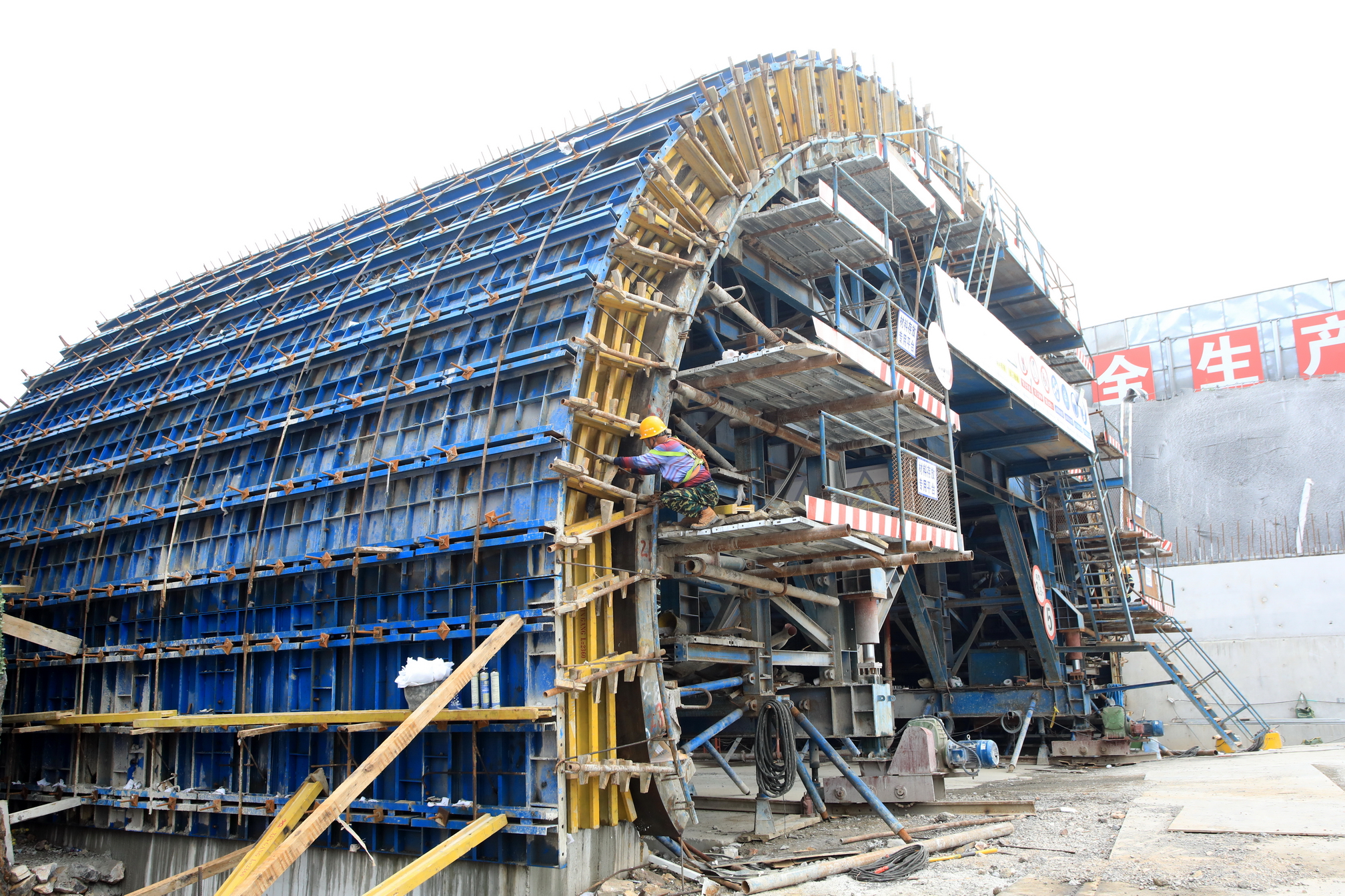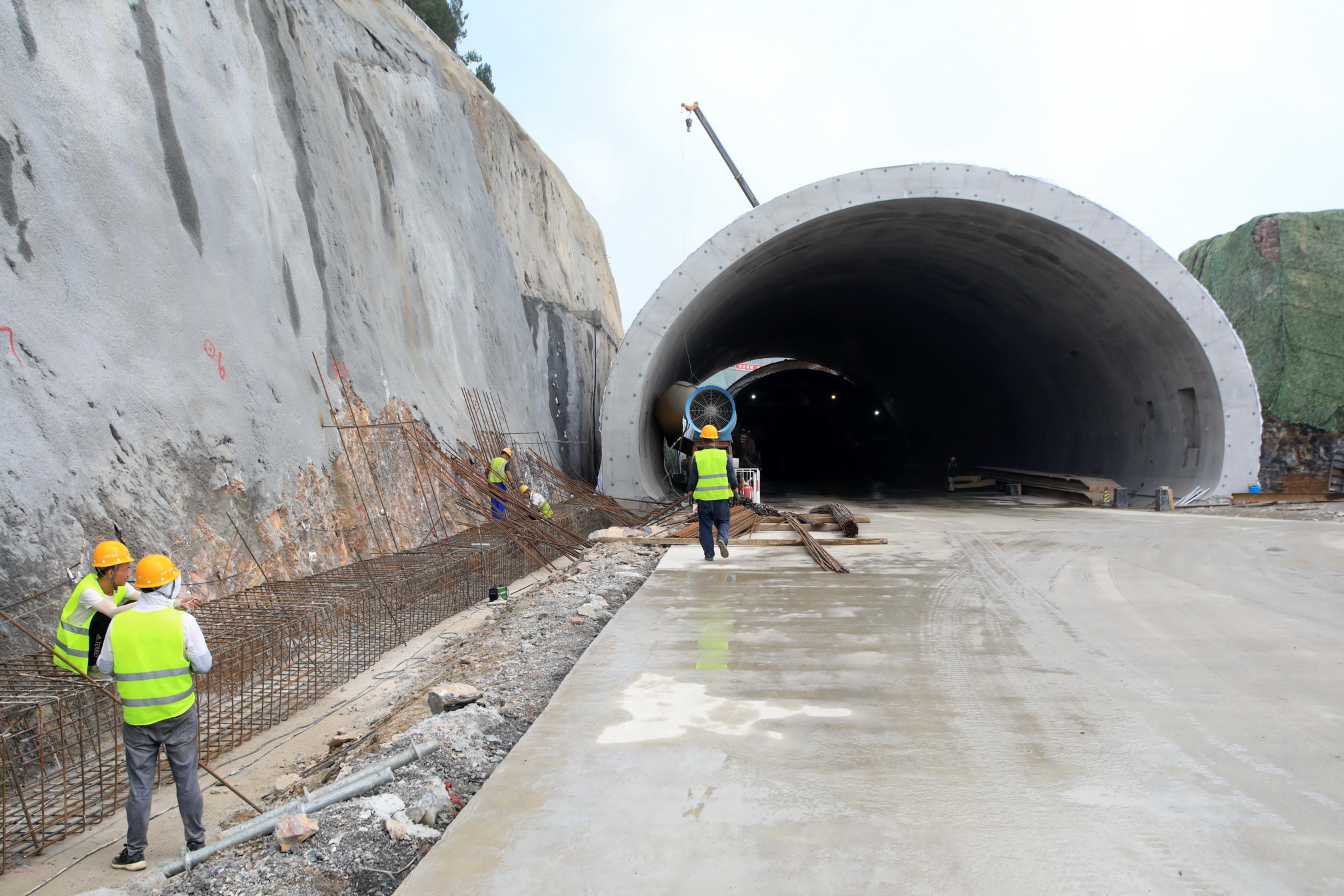 光明路隧道设计东西两线分离式隧道,在位于甘井子区山中二街附近的光明路隧道南洞口施工现场,工人们正在东线进行主体结构混凝土模板支护施工。