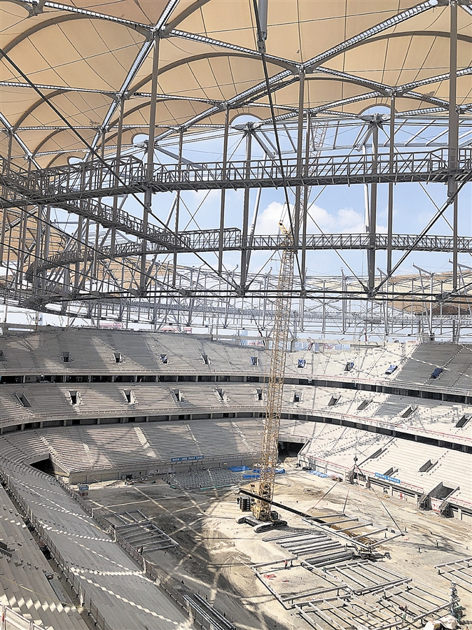 本报讯(大连新闻传媒集团记者吉存)当下正是建设施工的黄金时期。昨日,骄阳似火,工人们站在大连梭鱼湾足球场屋梁上进行屋面膜安装施工,战高温、斗酷暑,施工现场一派热火朝天。自5月7日屋面膜拱杆首吊施工完成后,截至目前,屋面膜拱杆已全部安装完成,224块屋面膜已完成安装142块,屋面膜整体施工完成63%。