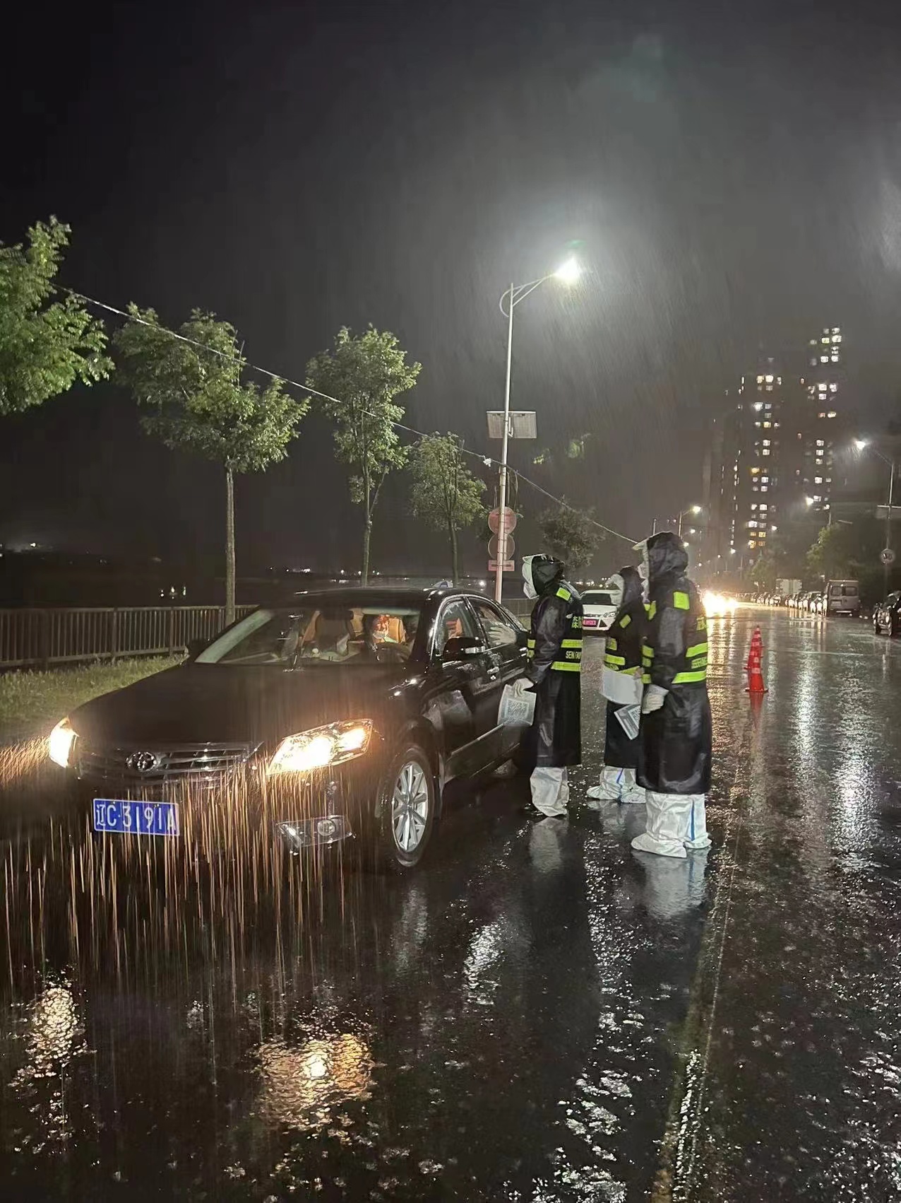 在龙王塘街道龙王塘村的卡口,由于过往车辆密集,两个卡口上8名工作人员顶着风雨就一直在“黄线”上来回穿梭。在这风雨交加的日子里,他们主动靠近驾驶室,俯下身来将场所码贴到车窗上,同时说:“风雨来袭,不要放下车窗,请扫码出行,谢谢合作。”进出人车都主动出示扫码记录,每个车主都主动鸣笛示意,每个居民都挥手道别。他们用风雨坚守行动保全居民不被雨淋、增加了出行的效率,更换来了大家的认可和村民的称赞。