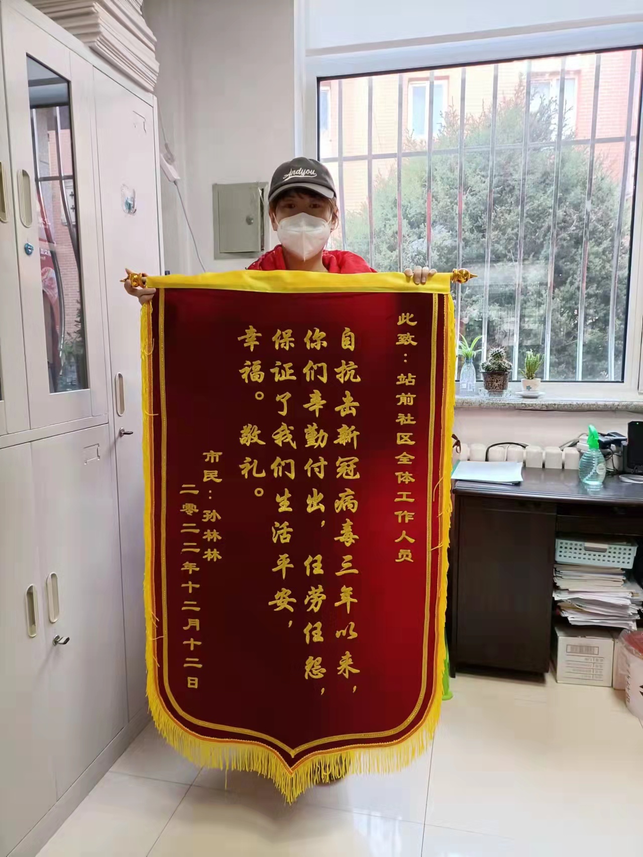 近日,甘井子街道站前社区一位居民给社区送来这样一面特殊的锦旗,感谢社区全体工作人员抗击新冠病毒三年来,为居民辛勤付出,保证大家生活平安、幸福。