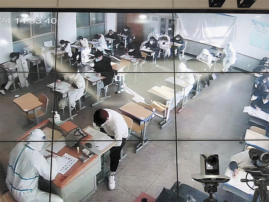 根据考前考生的核酸结果,部分重新编排的考场由“大白”教师完成监考。