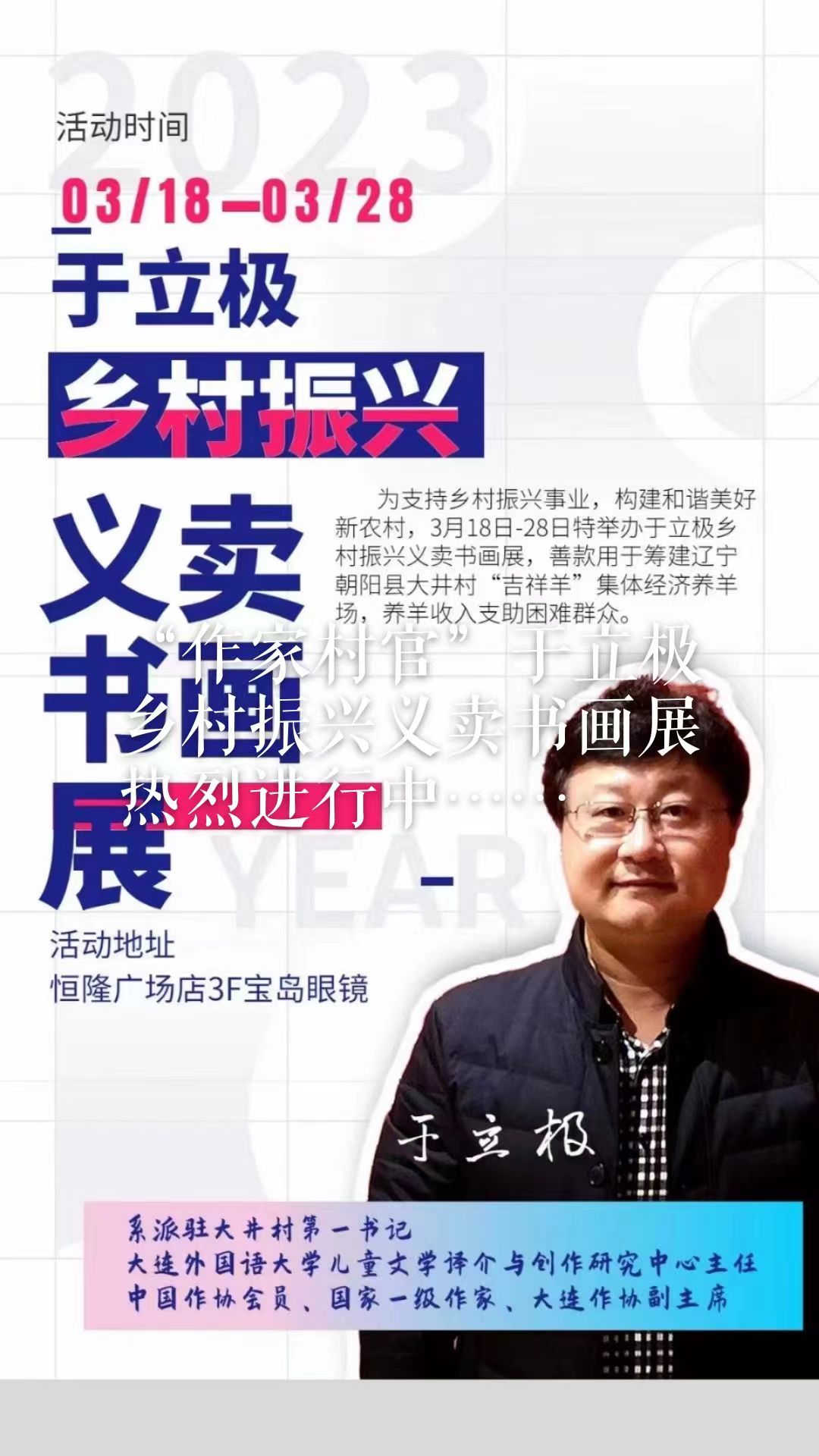 于立极是大连外国语大学儿童文学译介与创作研究中心主任,一级作家,大连市作家协会副主席。2014年,于立极主动报名参加辽宁省首批扶贫工作队。2021年9月,他第二次志愿投身乡村振兴事业,赴朝阳市朝阳县西五家子乡大井村任驻村第一书记。大井村地处辽宁和内蒙交界处,自然条件贫瘠,集体经济薄弱,绝大部分年轻人到城里打工,留下的多是老弱病残,甚至有一些村民因病返贫。于立极极力想改变这一现状,通过调研,他发现当地很适合养绒山羊,如果建一个养殖场,会为村里的留守老人带来一定的收入。于立极除从事文学创作外,30年来对书画印都有一定造诣。为解决资金问题,他想通过义卖书画作品,筹集10万元善款作为养羊场启动资金。通过十个月的努力,他拿出百幅作品呈现在广大市民面前。