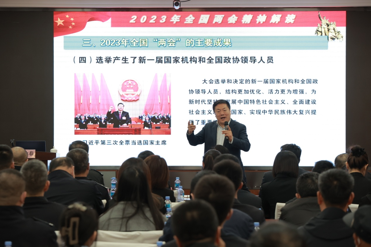 一名党员特警说:“我也是一名退伍军人。秦教授的宣讲热情似火,富有激情,也非常接地气。特别听到他讲 ‘党的二十大擘画蓝图,而全国两会描绘施工图’,深受启发。”