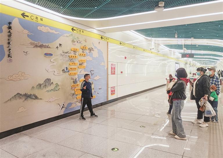记者看到,国风手绘线路图吸引了众多路过的乘客拍照打卡。目前,国风手绘线路图在虎滩新区站、虎滩公园站、青泥洼桥站、梭鱼湾站、后盐站、龙华路站、大连站7个车站均有展示,随后,将会在5号线的各个车站全部铺开,大连市书法家协会的书法家们题写的站名也会陆续在5号线的各个车站亮相。