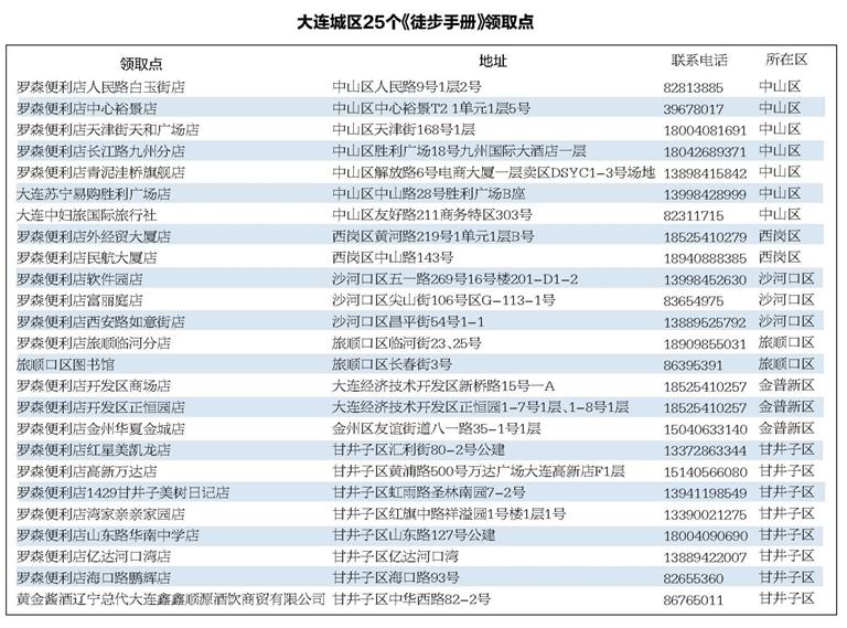 为方便徒步者领取《徒步手册》,5月10日—19日,在大连城区设置25个《徒步手册》领取点,可以凭报名订单,就近领取。