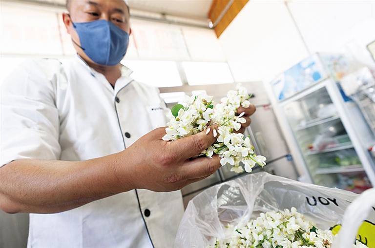 每到槐花盛开的时候,董志强就想用槐花制作独特的美食,芥辣培根槐花卷就是他想出来的一道槐花美食。