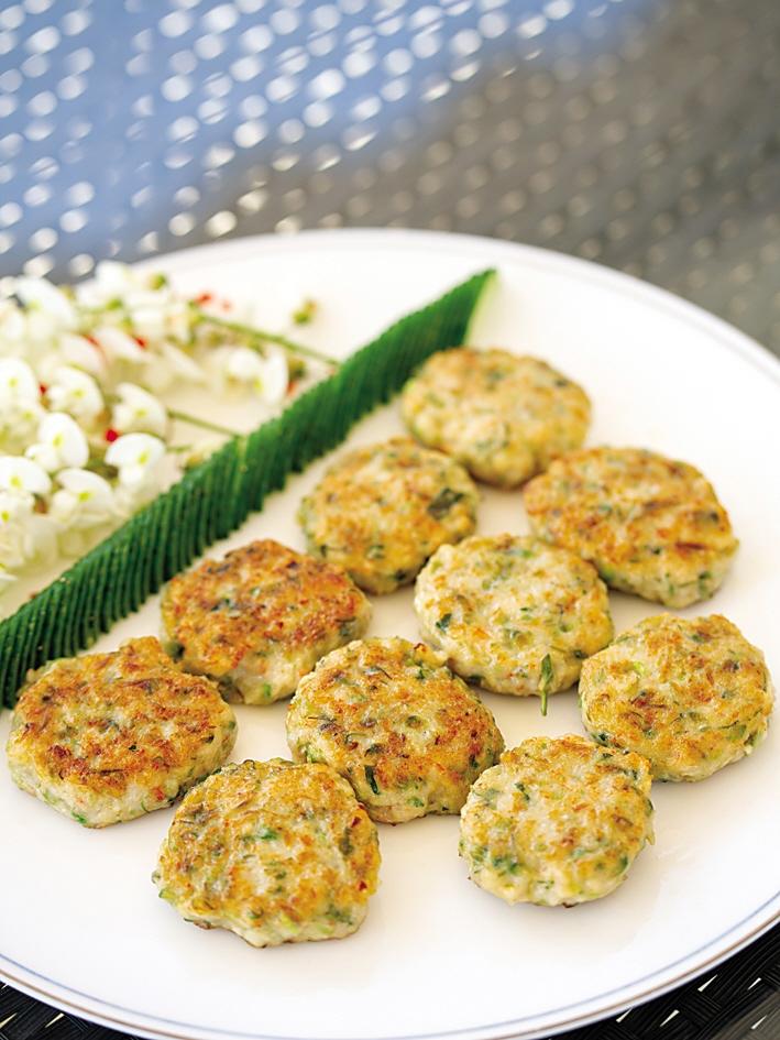 再跟大家分享一道适合在家庭制作的菜——虾胶槐花饼。这道菜做法很简单,先把虾肉打成泥,再加入槐花搅拌均匀。两手来回拍几下,做成手心大小的饼,放入电饼铛,电饼铛中提前加入油。当虾胶槐花饼两面金黄后,就可以出锅了。大厨用一串完整的槐花做装饰,色香味俱全,很适合老人和小朋友吃。