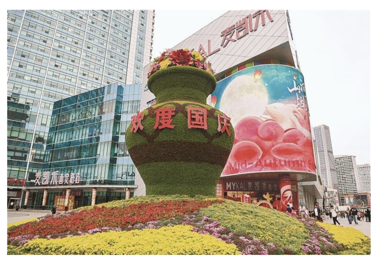 本报讯(大连新闻传媒集团记者吉存)这几天,经过全市城市建设和管理工作者的最后冲刺,滨城大街小巷,随处可见的鲜花和国旗,迎接着节日的到来。在西安路和黄河路交叉路口,一座高10米、直径15米的“欢度国庆”主题大型花瓶造型景观,格外醒目。这个造型景观共使用鲜花、彩叶植物10万多株,盛放的鲜花搭配五色草造型,吸引市民和游客驻足拍照。
