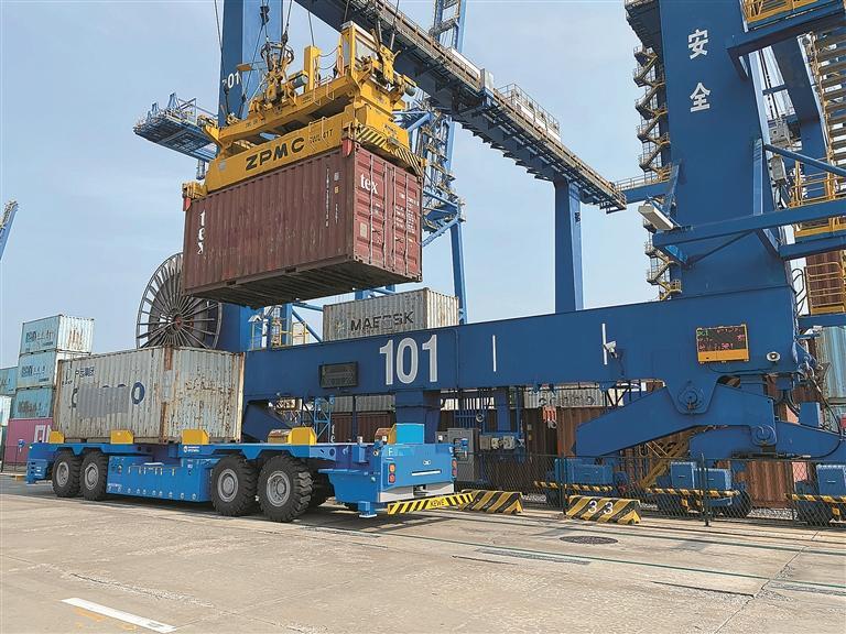 无人集卡配合自动化轨道吊进行集装箱作业。 大连新闻传媒集团记者秦至 摄