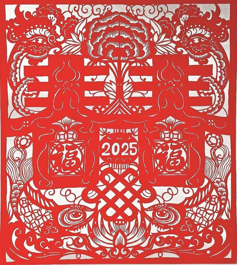 韩月琴是著名剪纸艺术家,她曾九获全国剪纸大赛金奖,在2008年获得了中国民间文艺最高奖“山花奖”,于2010年入选联合国教科文组织世界非物质文化遗产名录。这幅《金蛇狂舞闹双春》是韩月琴特意为蛇年春节而创作的。蛇年是“双春年”,“一闰逢双春,秋冬仓库盈”,是一个喜庆的年头。作品以双春字图案为中心,创造性地剪出了金蛇狂舞、牡丹花开和吉庆有余的美好意境,表现出蛇年吉祥、安康健美、丰收富足的祝愿之情。