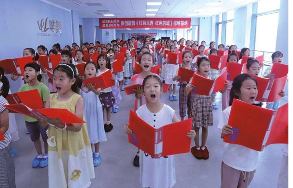 日前,沙河口区实验小学的学生们在排练基地引吭高歌,一曲清澈激昂的歌声久久回荡。为纪念抗战胜利80周年,该校在暑期精心策划了一场别开生面的“红色暑假”主题活动,组织学生们深情唱响由国家一级作曲家安九六创作的原创红歌《红色大连 红色的城》,用童声传递红色力量。