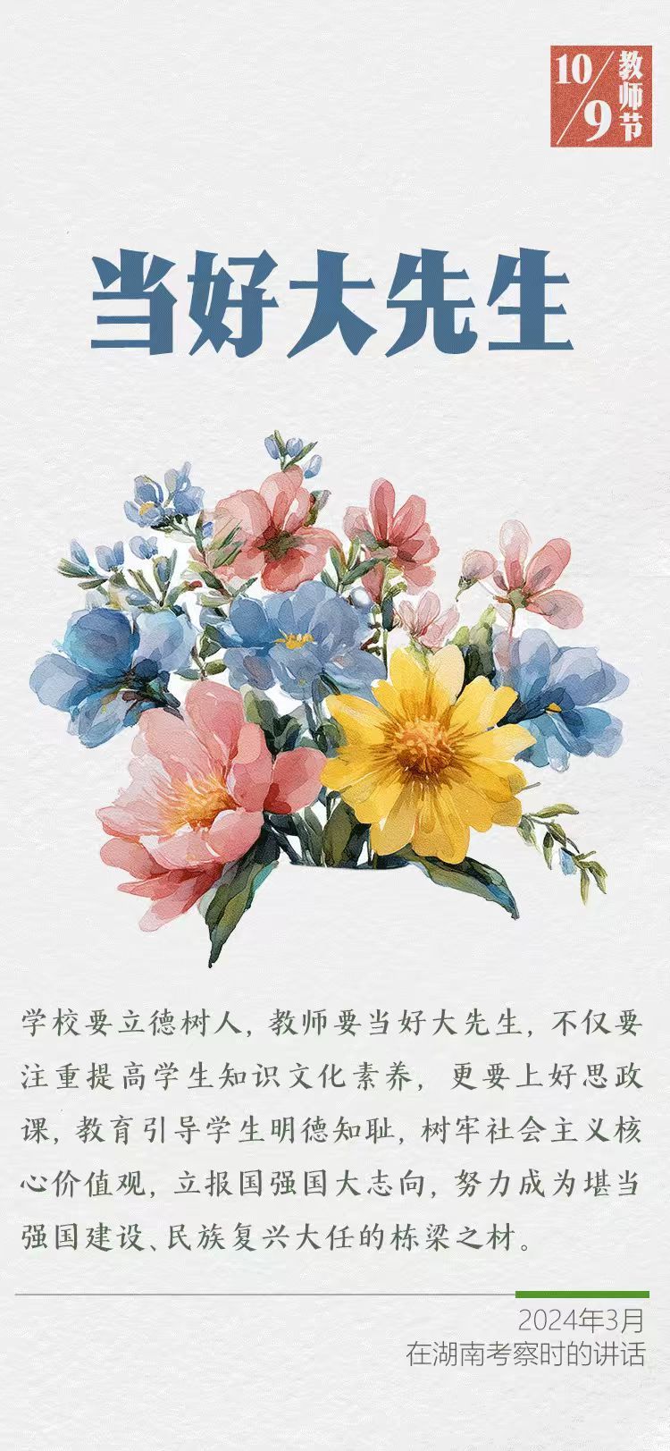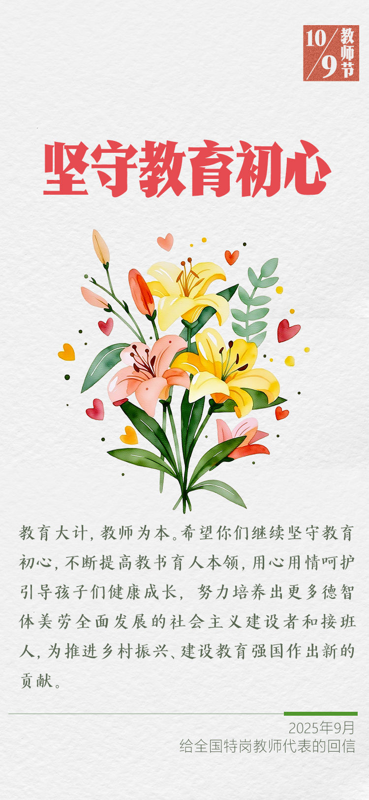在第四十一个教师节到来之际,习近平总书记给全国特岗教师代表回信,提出殷切希望,并向全国广大教师和教育工作者致以节日祝贺和诚挚问候。