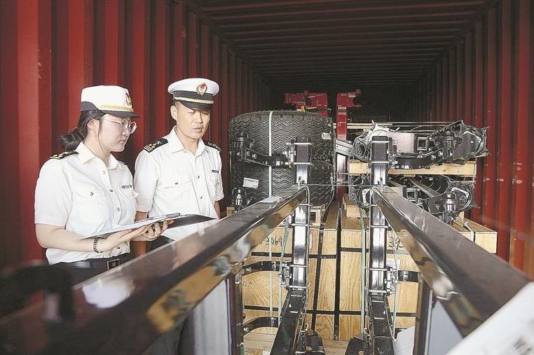 海关关员对进口农机进行现场查验。梁艺严 摄