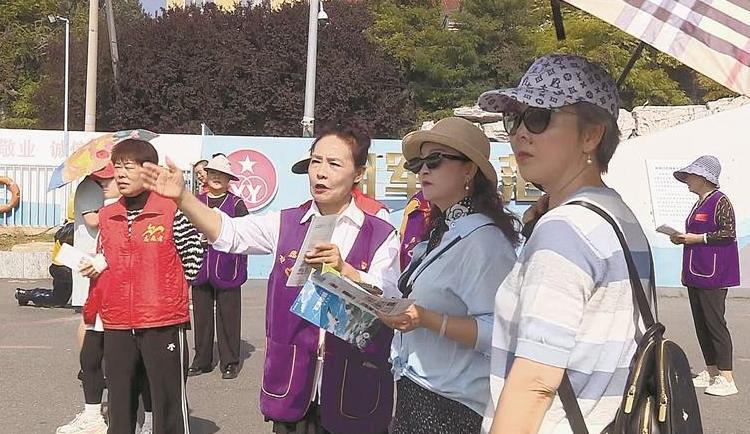 旅顺口区志愿者在景区进行秩序引导与义务讲解。受访单位供图