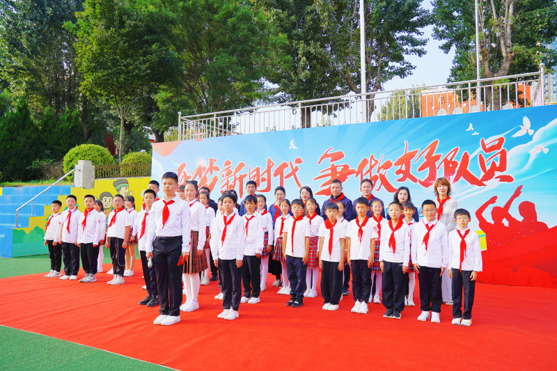 仪式尾声,高婷副校长公布新中队及中队辅导员名单,大队辅导员为新中队授予队旗。各中队辅导员接过队旗后挥舞致意,向新队员们寄语:“希望大家牢记队旗的嘱托,爱戴红领巾、珍重红领巾,传承红色基因,争做有理想、有本领、有担当的新时代好队员。”