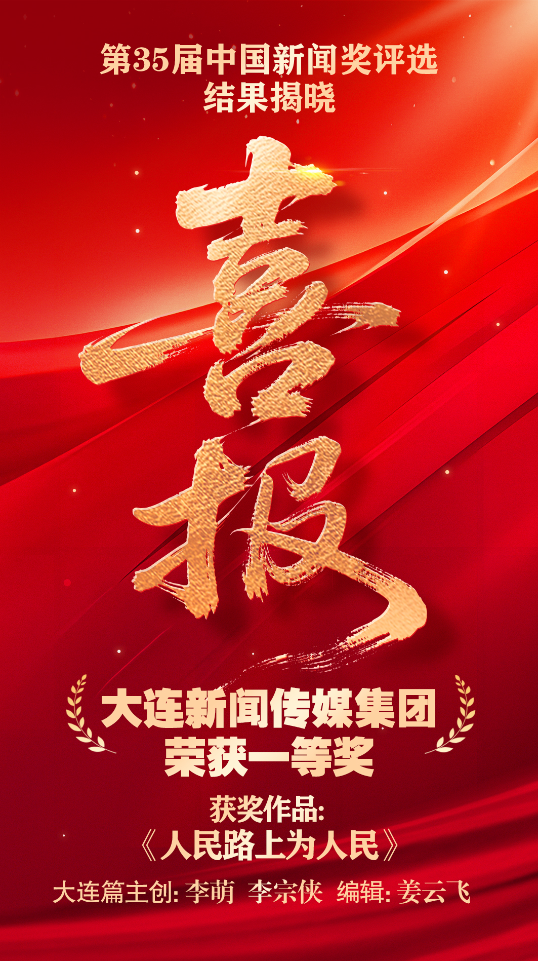 由中华全国新闻工作者协会主办的第35届中国新闻奖评选结果于11月5日揭晓,大连新闻传媒集团参与的重大主题报道《人民路上为人民》喜获一等奖。这是本届中国新闻奖大连唯一获奖作品,也是大连新闻传媒集团成立以来首次荣获中国新闻奖一等奖。
