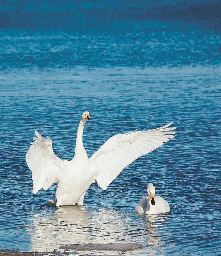 本报讯(大连新闻传媒集团记者姜莹)近日,记者在旅顺老虎尾海湾水面上看到,一群洁白美丽的大天鹅在戏水畅游。清澈的海水映照着这些白色精灵,舞动翅膀如痴如醉,引来众多游人驻足观赏。