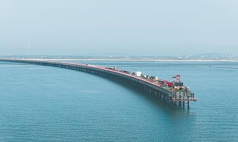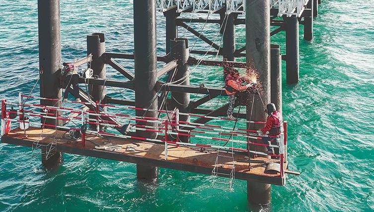 据介绍,为确保年度任务目标顺利完成,目前工程开通三个作业面,从海上和陆域两个方向同步铺设,投入多台大型起重设备和海上船舶,每天推进约70米。中建八局承担项目关键线路施工,项目团队攻克极端环境风浪、气象等环境影响,成功突破多项技术瓶颈,为超长距离海上栈桥工程施工提供了可复制的实践经验。