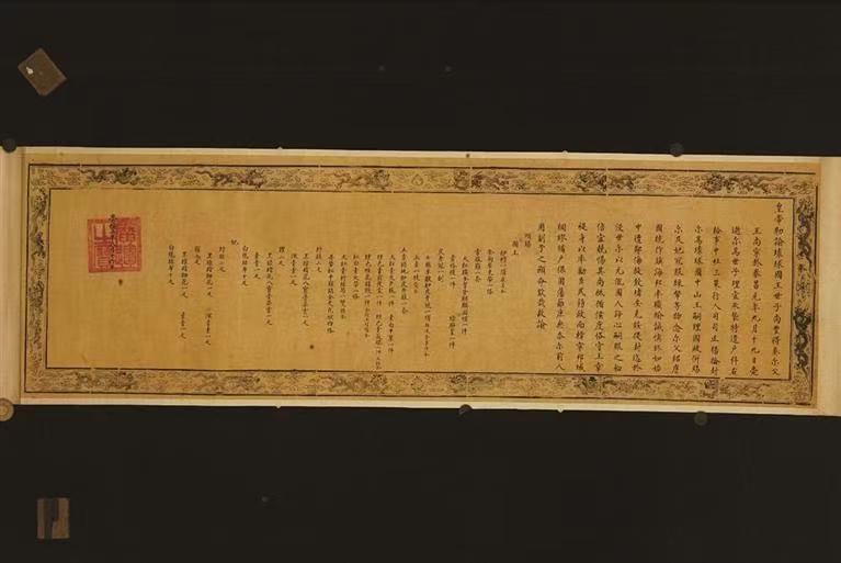 据介绍,“敕谕”横172厘米,纵55厘米,纸较厚硬,为二级文物,具有重要历史、艺术、科学价值。展品为1:1复刻件,四周金色云龙花边图案都清晰可见,行文为楷书,共44行,每行1至18个字不等,末尾署“崇祯二年八月十六日”,钤朱文方印“广运之宝”。真迹为罗振玉旧藏,有罗振玉题外签“明崇祯二年谕琉球国王世子尚丰敕”,现藏于旅顺博物馆。