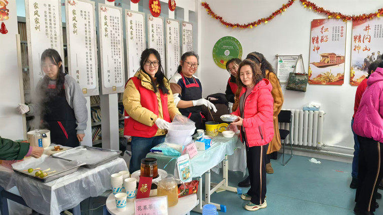 活动现场更化身“年味博物馆”,设置多个互动体验区,让群众在沉浸式体验中感受传统年俗。“甜蜜工坊”里,孩子们在志愿者指导下制作冰糖葫芦,爆米花机“嘭嘭”作响,雪白的米花漫天纷飞,引得孩子们欢呼雀跃;棉花糖机吐出缕缕糖丝,缠绕成云朵般的甜蜜,勾起了老人们的童年回忆。“暖心茶铺”内,社区工作人员精心准备了适老花果茶,氤氲热气驱散冬日寒意;“包住幸福,捏紧财富”饺子制作区欢声笑语不断,老党员们围坐一堂,将团圆期许与反诈心愿包进馅料,特制的“幸运饺子”内藏糖果,寓意“守住钱袋、甜满心头”,让年味里多了一份守护与安心。