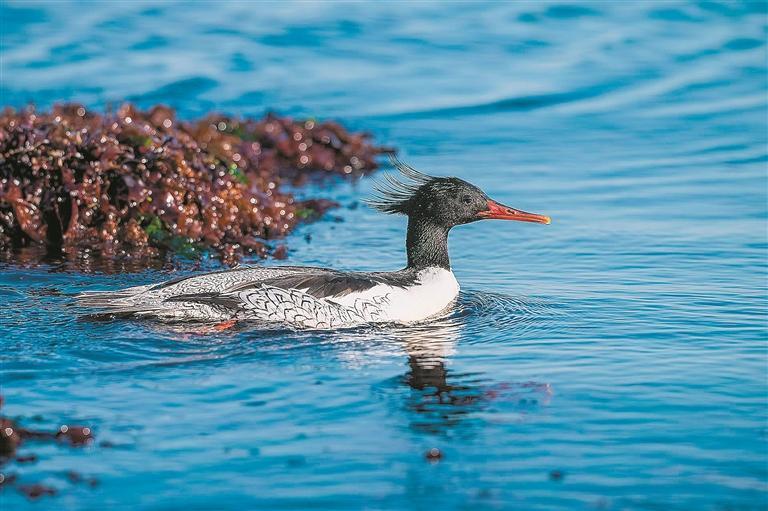 近日,一只国家一级保护动物,被誉为“鸟中活化石、水中大熊猫”的中华秋沙鸭时隔20多年再次现身大连海之韵公园附近海域。据大连野生动植物保护协会常务副会长谷国强介绍,目前全球中华秋沙鸭不足5000只,这只应该是迷鸟,大连不是该鸟的分布区。2005年,曾有只也是迷鸟的中华秋沙鸭出现在大连,可惜当时受伤,没来得及救治便死去了。这次出现的这只中华秋沙鸭非常健康,希望它能在大连海域待得长久些。